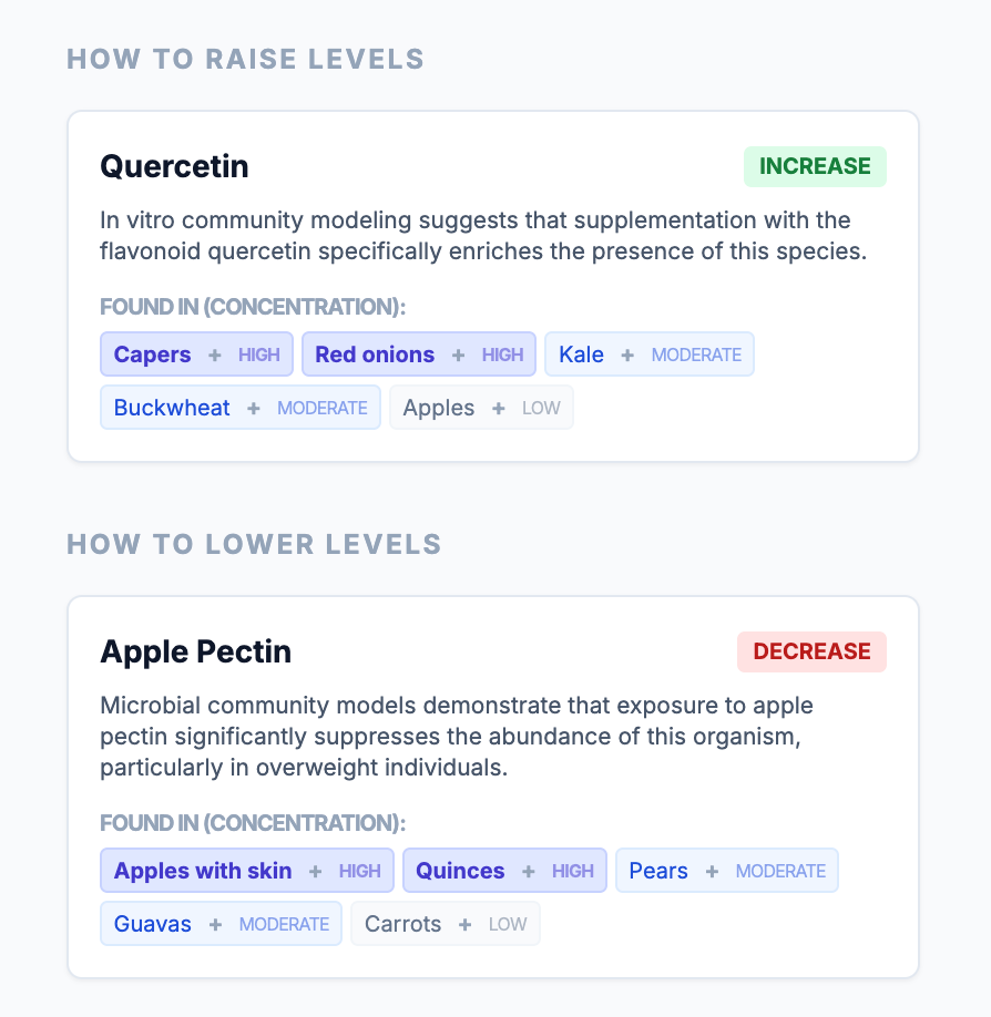 We make it easy to action certain species you want to adjust by listing common foods (supplements or probiotics) + relative concentrations that may increase or decrease that particular species! Implement the action items for the species you would like to adjust and come back to see how patterns shift.