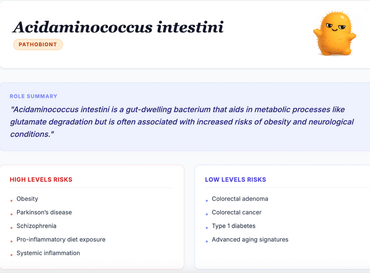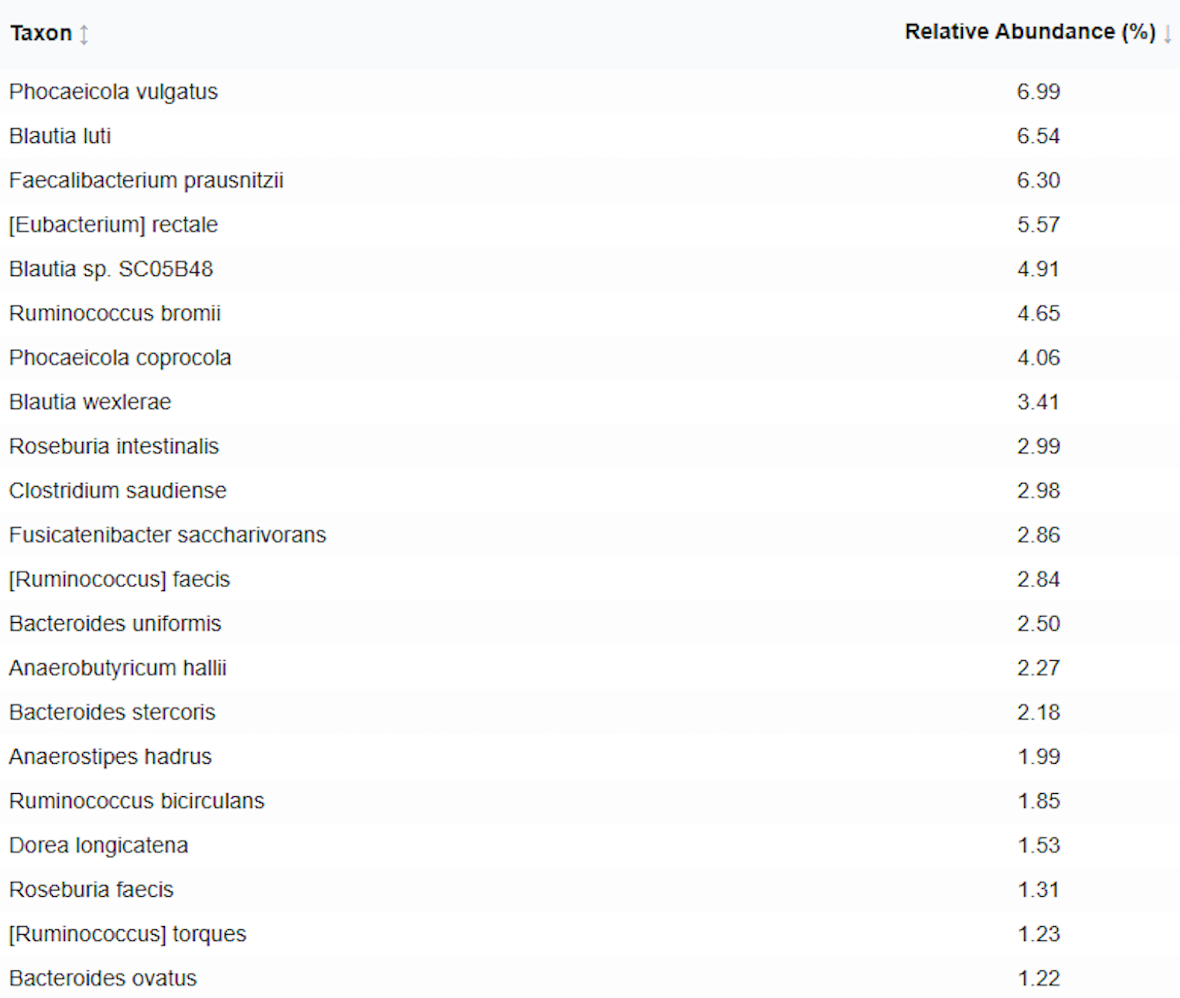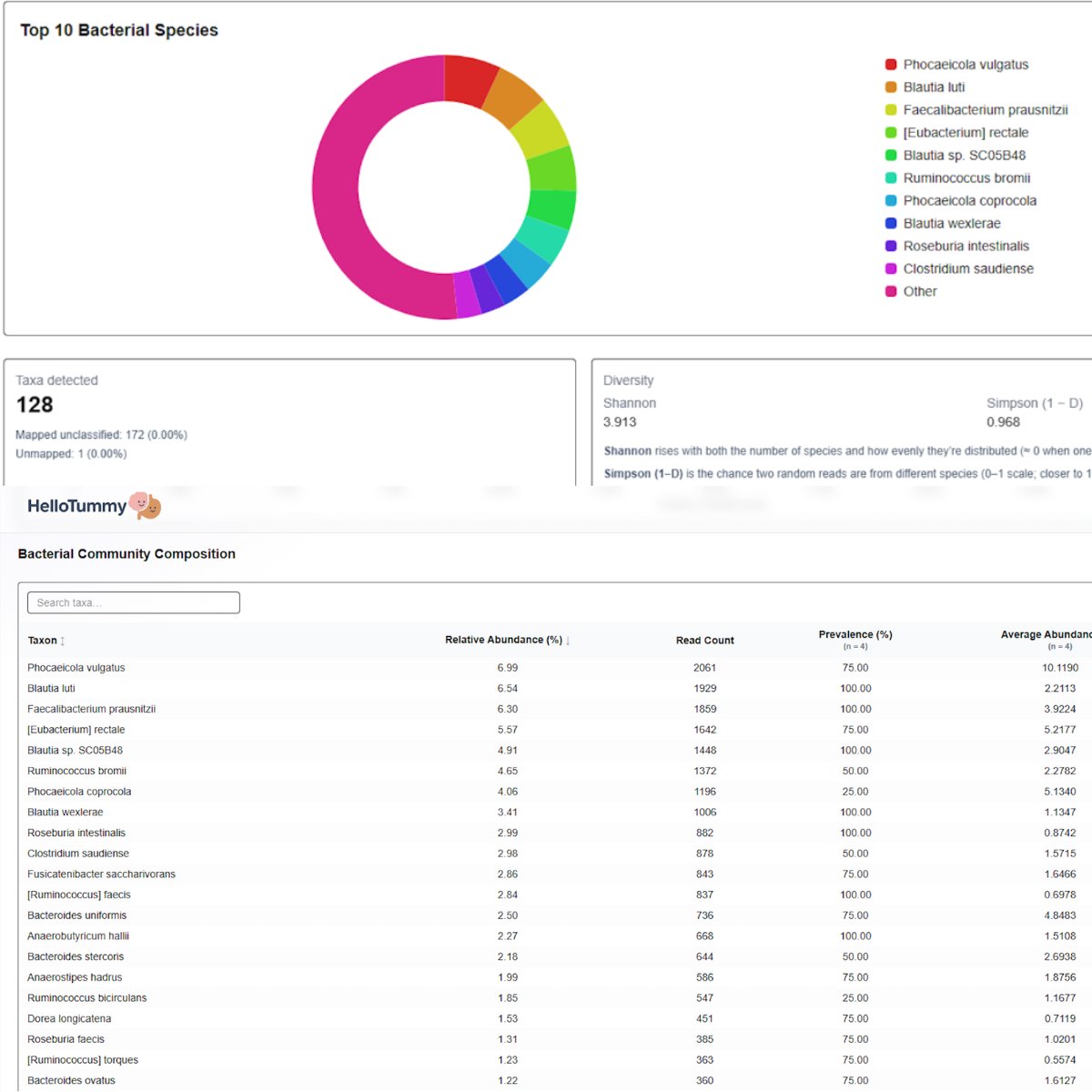 You’ll see every bacterial species we detect in your sample and diversity, along with its relative abundance (how much of your gut each species makes up) and role. You will also be able to see if you are above average, average, or below average in each species compared to our dataset.